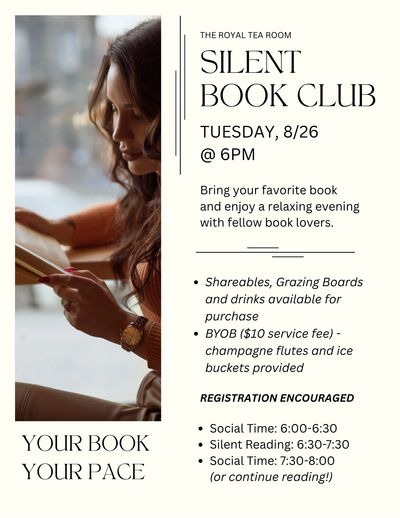 What: Join us for a quiet evening of tea and reading at The Royal Tea Room. Bring your own book, settle in with a cup of your favorite tea, and enjoy a peaceful hour of uninterrupted reading in good company. No assigned books, no discussion required—just the comfort of a cozy space, shared silence, and the joy of getting lost in a good story.