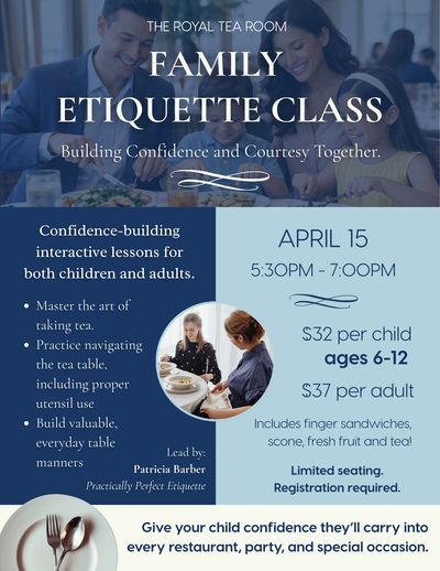 What: Join us at The Royal Tea Room for a confidence-building etiquette experience designed for families with children ages 6–12. This interactive class invites adults and children to learn side-by-side in a relaxed, welcoming setting.