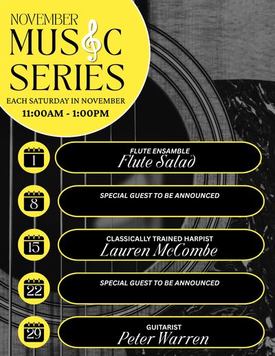 What: Join us at The Royal Tea Room for our November Music Series, featuring live performances each Saturday from 11:00 AM – 1:00 PM. Sip, savor, and soak in the sounds as talented local musicians fill the tearoom with melody.